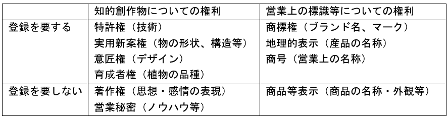 表の一行目に記載する通り、知財には大きく分けて(a)「知的創作物についての権利」と、(b)「営業上の標識等についての権利」との2つのタイプがあります。前者は、知的創作の労に報い、さらなる創作を奨励するものであるのに対し、後者は特定の表示に結びついて蓄積された商業上の信用を保護するものという特徴があります。