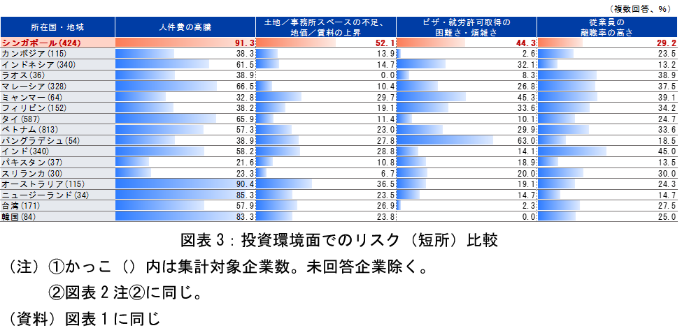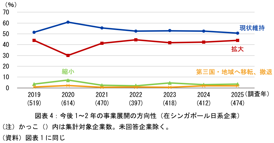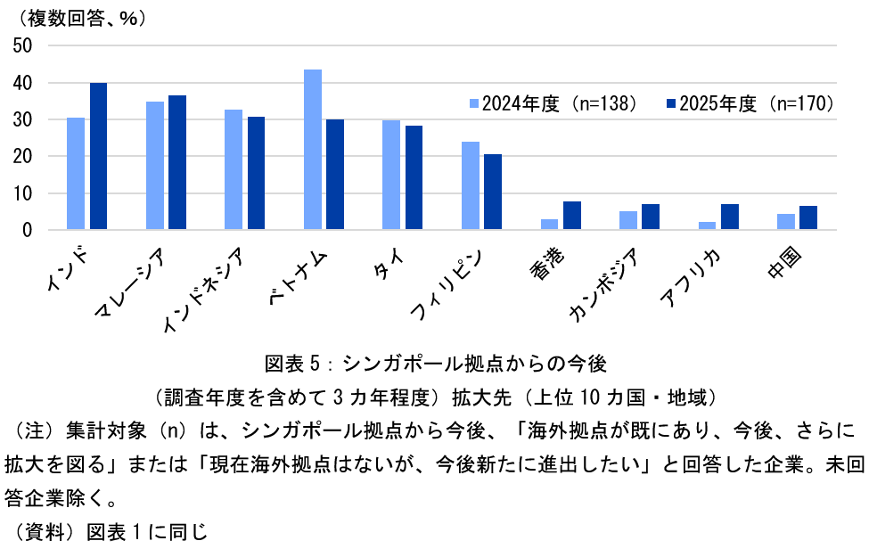 なお、中国との関連では、「取り扱う製品、狙う市場において、中国企業の影響を大きく受けている」(販売会社C社)、さらには「中国企業の影響力は年々強まっていると感じる」(販売会社D社)との声が聞かれる。本調査では、進出先市場(国・地域)における1番の競争相手として、「地場企業」(26.9%)と回答した割合が最も高く、「中国企業」(24.6%)、「日系企業」(20.5%)が続いた。一部では、「中国品がアジア大洋州地域に流れることにより、過当な価格競争が引き起こされる懸念がある」(化学・医薬E社)など、中国の影響がさらに強まるとの懸念も聞かれる。もっとも、業種によっては、ASEAN展開を加速する中国企業の取り込みを狙う声も聞かれる。「脱中国が加速し、中国企業がASEANへ進出する傾向が強まり、需要が増加すると見込まれる」(商社・卸売業F社)、「中国から東南アジアに進出してくる企業からの仕事を増やす」(運輸業G社)との声が寄せられた。